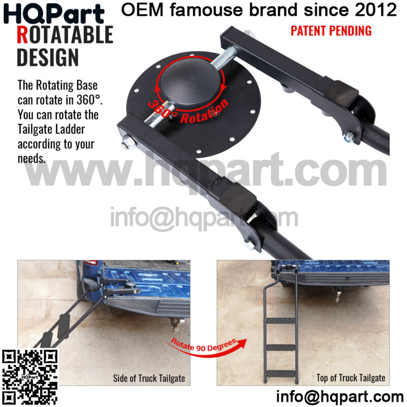 The Tailgate ladder adopts a Omni-directional base, and the round pipe connection makes it not only rotatable in the horizontal direction, but also in the vertical direction to meet all the use requirements.
