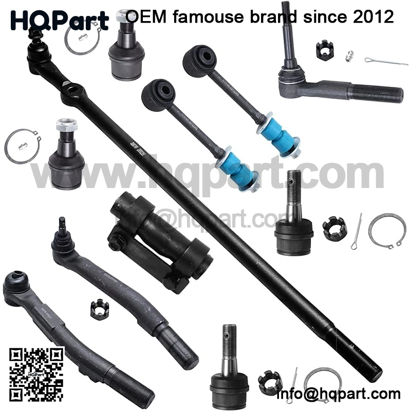 Kit Includes: 1x Pitman Arm + 1x Adjusting Sleeve + 2x Outer Tie Rods + 1x Drag Link + 2x Front Lower Ball Joints + 2x Front Upper Ball Joints + 2x Front Stabilizer / Sway Bars
