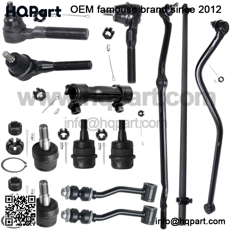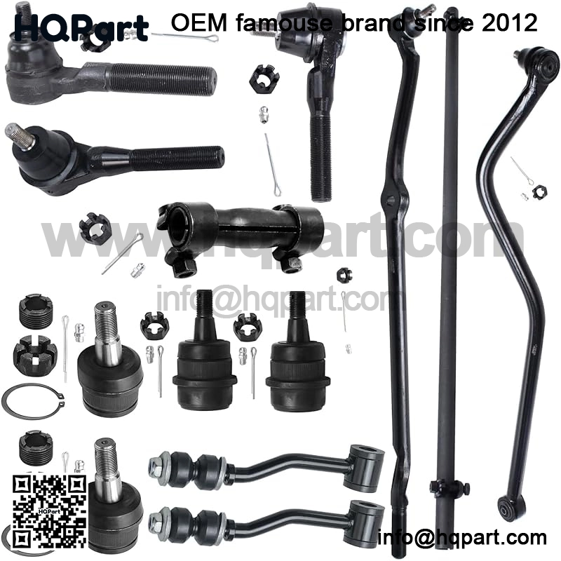 Kit Includes: 2x Outer Tie Rods, 1x Right Inner Tie Rod, 2x Adjusting Sleeves, 2x Sway Bar End Links, 2x Upper Ball Joints, 2x Lower Ball Joints, 1x Right Outer Drag Link and 1x Track Bar