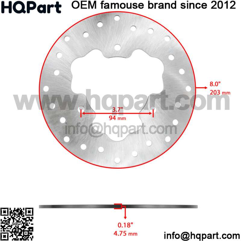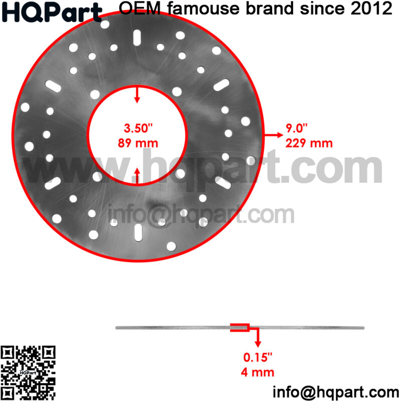 Front Disc Inner Diameter 3.50″ | 89mmFront Outer Diameter 9.0″ | 229mmFront Disc Thickness 0.15″ | 4mmRear Outer Diameter 8.0″ | 203mmRear Disc Thickness 0.18″ | 4.75mmRear Disc Mounting Hole Distance 3.7″ | 94mm Order Includes: