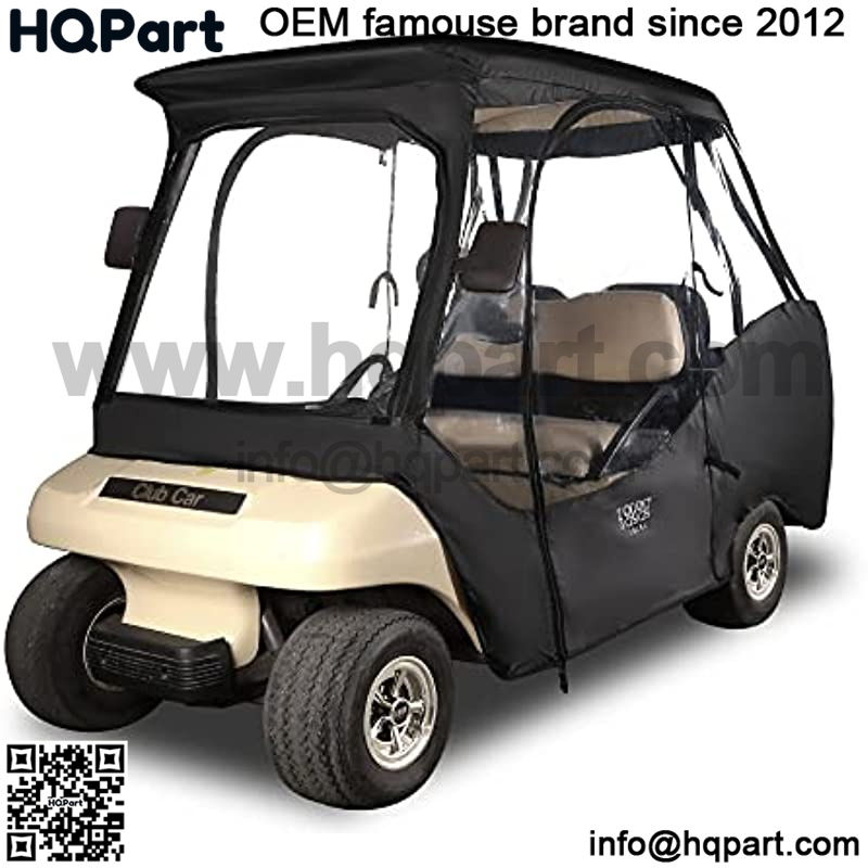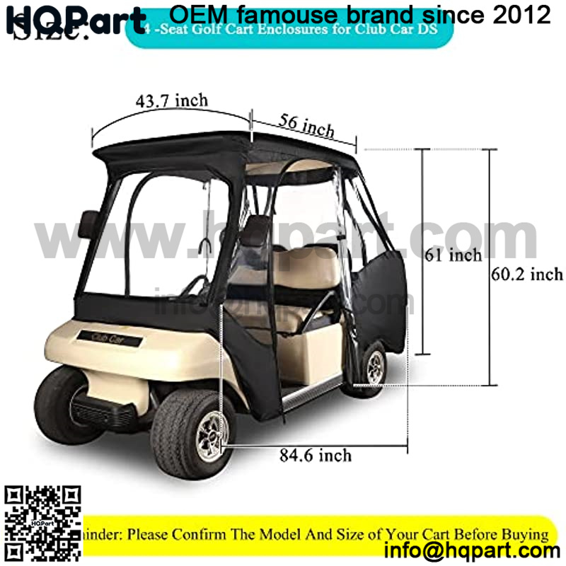 4-sided enclosure, universal fit for Golf cart Club Car DS 4passenger,Made by 600D high density& heavy duty Oxford Cloth, and inner used PU layer, enhance strength of tear and rainproof protection, The enclosure top roof adopt a curved, aerodynamic design, make the whole enclosure naturally cover the cart top roof.