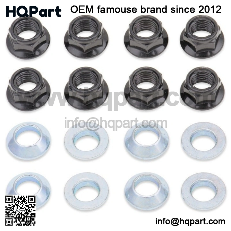 Designed to eliminate the troublesome problem of lugs that work their way loose. Ideal for stock or paddle wheels. Contains eight silver (or black plated) locking nuts for lugs that use a flat lugnut and eight tapered adaptors for lugs the use a tapered lugnut. Simply use the tapered bushing in conjunction with the flat lugnuts when your wheels require tapered lugs. Fits full size Japanese sport & utility ATV’s. This item also available in a black finish.