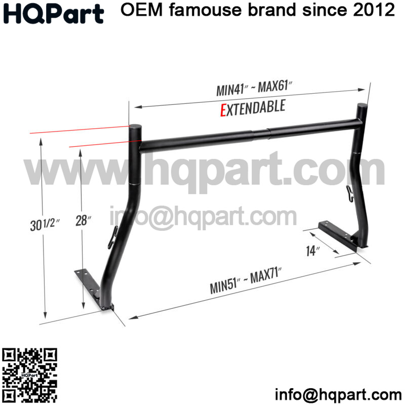 It features the extendable top cross-bar which can be adjusted for different size bed width. The adjustable range covers inner bed width from min. 51″ to max. 71″. The height is 30.5″ to the clearance and 28″ to the cross bar. The upright mounting plate is a flat L-shaped plate with five (5) drilling holes.Please pick two (2) that fits your bed rail.
